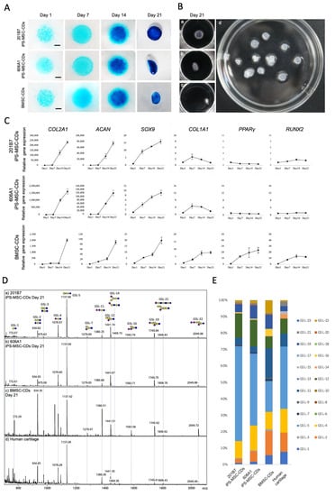 High-density micromass culture using bone marrow-derived mesenchymal stem cells (BMSCs; passage 3) and iPS-MSC like cells (passage 6) was performed as previously described []. Cells were seeded in 24-well plates at a density of 2.0 × 105 cells/well in a final volume of 10 μL/drop, and then incubated for 2 h at 37 °C to allow adherence. At that time, 1 mL MSC induction medium was added to each well. These cells were defined as BMSC-derived chondrocytes (BMSC-CDs) and iPS-MSC-CDs day 0. After cultivation for 24 hours, the culture medium was replaced with chondrogenic medium. These cells were defined as BMSCs and iPS-MSC-CDs day 1. On day 2 of cultivation, the culture medium was replaced with chondrogenic medium containing human recombinant bone morphogenetic protein-2 (BMP-2) at a final concentration of 100 ng/mL (14-8507; eBioscience/Thermo Fisher Scientific, Waltham, MA, USA). Medium treated with human recombinant BMP-2 was replaced three times per week until day 21 of cultivation. Cells were harvested and analyzed at four time points (days 1, 7, 14, and 21).