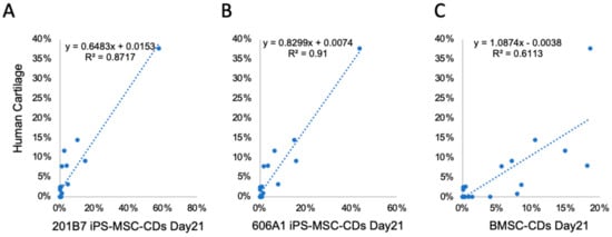 Correlation analysis between GSL-glycans of human cartilage and chondrogenic differentiated cells. (A) 201B7 iPS-MSC-CDs at day 21. (B) 606A1 iPS-MSC-CDs at day 21. (C) BMSC-CDs at day 21.