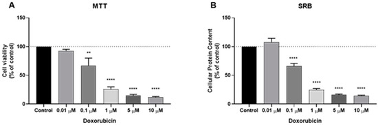 Effects of doxorubicin (DOX) on (A) cell viability and (B) cellular protein content. Cells were cultured in the presence of increasing concentrations of DOX. After 48 h MTT and SRB assays were performed to measured cellular viability as well as protein content. Values are expressed in percentage and represent means ± SEM. Each experiment was done three times independently (n = 3); ** statistically significant vs. control at p < 0.01. **** statistically significant vs. control at p < 0.0001.