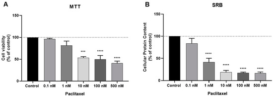 Effects of paclitaxel (PTX) on (A) cell viability and (B) cellular protein content. Cells were cultured in the presence of increasing concentrations of PTX. After 48 h MTT and SRB assays were performed to measured cellular viability as well as protein content. Values are expressed in percentage and represent means ± SEM. Each experiment was done three times independently (n = 3) *** statistically significant vs. control at p < 0.001. **** statistically significant vs. control at p < 0.0001.