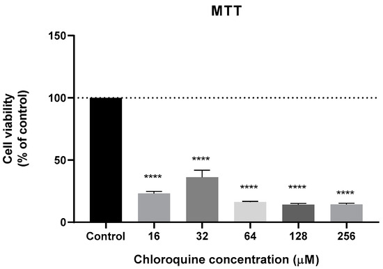 Effect of chloroquine in the cell viability of MCF-7 cells. Cells were cultured in the presence of increasing concentrations of chloroquine. After 48 h, MTT assay was performed to measured cellular viability. Values are expressed in percentage and represent means ± SEM. Each experiment was done three times independently (n = 3); **** statistically significant vs. control at p < 0.0001.