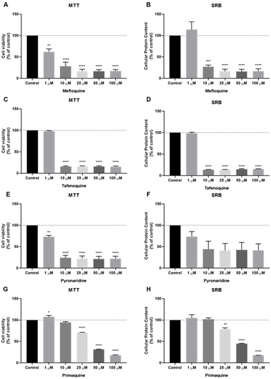 The cells were then treated with increasing concentrations of each antimalarial drug (mefloquine, tafenoquine, 6-methoxy-nitroquinoline, pyronaridine, primaquine. and sitamaquine), starting from 1 µM to 100 µM to evaluate cell viability and cellular protein content after 48 h treatment, by MTT and SRB assays, respectively. These antimalarial drugs were grouped and chosen because they share a common structural feature: A quinolinic ring (1–7, Scheme 1). Based on the MTT assay, cytotoxic effects of mefloquine (Figure 4A) were significant even in concentrations of 1 µM, with higher concentrations causing a reduction of more than 50% of the cells (Figure 4A). SRB results show a significant decrease in protein content inside these cells (Figure 4B). Both MTT and SRB assays for tafenoquine treatment demonstrate a strong cytotoxic effect of this antimalarial drug in MCF-7 cells for all concentrations tested above 10 µM (Figure 4C,D). Pyronaridine treatment also significantly decreased cell viability, from 1 µM to 100 µM, with a pronounced effect for all concentrations above 10 µM (Figure 4E). SRB results are not significative but demonstrate the same tendency as MTT results (Figure 4F). MCF-7 cells treated with primaquine at doses up to 10 µM for 48 h, had little effect on cell viability and cellular protein content (Figure 4G,H). Above 50 µM, this drug caused a reduction of more than 50% of cell viability and protein synthesis. All concentrations showed a strong effect in the cell viability of MCF-7 cells, with more than 50% of the cells not viable. MTT and SRB assays for 6-methoxy-nitroquinoline and sitamaquine demonstrate a lack of efficacy of these antimalarial drugs on the reduction of cell viability and protein content (Figure S1).
