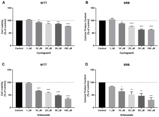 We also evaluated the cytotoxic potential of several antimalarial non-quinolinic derivates, namely artesunate, lumefantrine, cycloguanil and atovaquone. The cells were treated as previous described. Based on MTT and SRB results, cytotoxic (Figure 5A) and protein synthesis effects (Figure 5B) of cycloguanil were significant for concentrations above 10 µM, but the effect was less pronounced than the previous family of antimalarial drugs. Artesunate treatment demonstrated a higher reduction in cell viability (Figure 5C), in concentrations above 10 µM, to a higher extent than cycloguanil, with a reduction of more than 50% of cell viability in concentrations of 50 µM or more. SRB results for artesunate treatment are similar to those obtained by the MTT assay (Figure 5D). Neither atovaquone nor lumefantrine demonstrate good efficacy against MCF-7 cells, both in MTT and SRB assays (Figure S2).