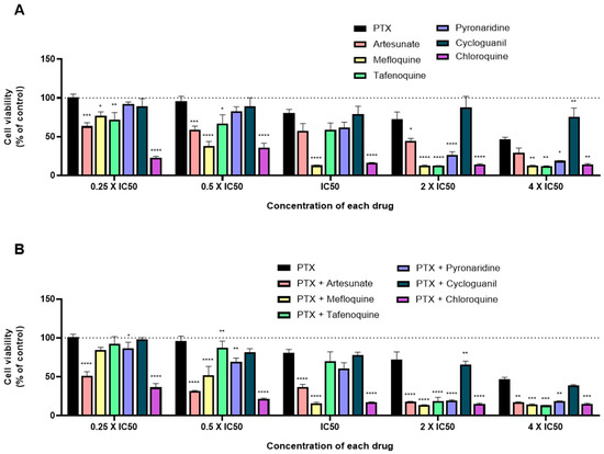 To evaluate the influence of the antineoplastic agent, we evaluated the same antimalarial drugs with PTX. Drugs were also tested in MCF-7 cells both alone and combined in the concentrations of 0.25 × IC50, 0.5 × IC50, IC50, 2 × IC50, and 4 × IC50 for 48 h. Cell viability was measured by the MTT assay. Comparing to DOX, PTX demonstrated a higher efficacy in decreasing cell viability, which resulted in a lower IC50 of around 3 nM, comparing to 0.1 µM for DOX (Figure 8A). Although it has a lower IC50, when tested alone for all concentrations, this drug does not affect MCF-7 cell viability to a larger extent than DOX. When compared to PTX activity, mainly for higher doses (2 × IC50 and 4 × IC50), almost all antimalarial drugs demonstrate significant anti-cancer activity, with mefloquine, tafenoquine, and chloroquine having the best profiles for further combination (Figure 8B). Indeed, when combined with PTX in higher doses (2 × IC50 and 4 × IC50), all antimalarials resulted in a significant reduction of viable cells, with the exception of cycloguanil. For lower doses, the combinations of PTX with artesunate, mefloquine, and cycloguanil are the most promising ones. Comparing antimalarial drugs combinations with DOX and PTX, the last ones seem to be most effective for breast cancer therapy.