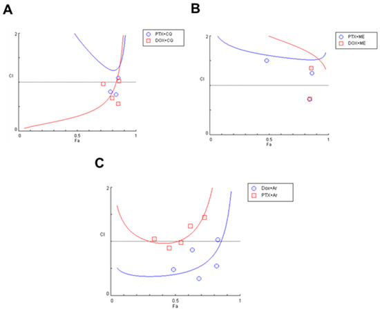 Chou-Talalay method Fa-CI plot of DOX/PTX and chloroquine (A), mefloquine (B) and artesunate (C). CI was plotted on y-axis as a function of effect level (Fa) on the x-axis to assess drug synergism. CI < 1, CI = 1 and CI > 1 indicate synergism, additivity, and antagonism, respectively.