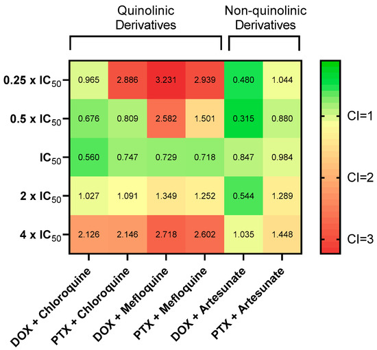 Synergy heat map compiling CI values. The squares in the figure indicate antagonism (CI > 1.2, red), additivity (0.9 < CI < 1.1, yellow), and synergism (CI < 0.9, green) between DOX/PTX and chloroquine/mefloquine/artesunate against MCF-7 cells at combination settings described in Figure 6.