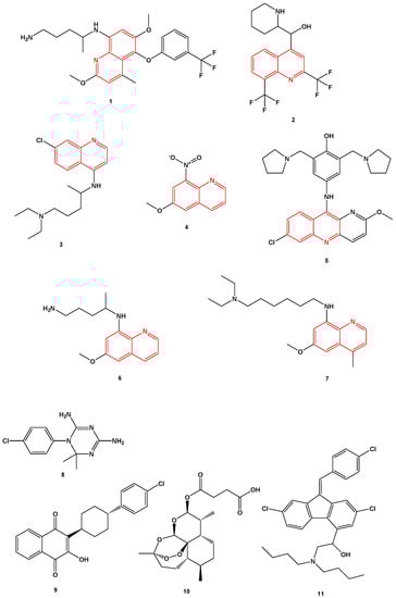 Chemical structures of the antimalarial drugs used in combination with antineoplastic in this work. Several compounds share a heterocyclic aromatic organic motif called quinoline (in red). Tafenoquine (1), mefloquine (2), chloroquine (3), 6-methoxy-nitroquinoline (4), pyronaridine (5), primaquine (6), sitamaquine (7), cycloguanil (8), atovaquone (9), artesunate (10), and lumefantrine (11).