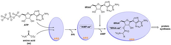 Aminoacyl-tRNA synthetases (ARSs) are a family of 20 essential enzymes that ligate amino acids to their corresponding tRNAs and translate the genetic code during protein synthesis []. The two-step catalytic reaction of ARSs involves the formation of an enzyme-bound aminoacyl-adenylate (AMP-aa) followed by the formation of an aminoacylated tRNA (tRNA-aa) by transferring the amino acid to the corresponding tRNA. This catalytic reaction of ARSs plays a pivotal role in protein synthesis, which is essential for the growth and survival of all cells (Figure 1). ARSs have long been studied as therapeutic targets for pathogen-derived infectious diseases, predominantly because of concerns that ARS catalytic site inhibitors would block translation in normal cells [,,]. In this regard, various seminal reviews have discussed ARS inhibitors for the development of antibiotics from different perspectives [,,,,].