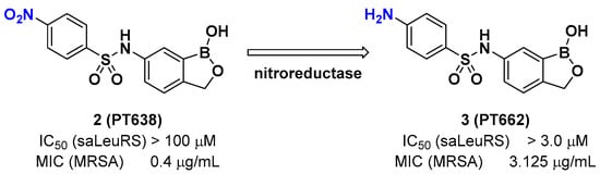 A recent example of the benzoxaborole class of inhibitors is the nitrophenyl sulfonamide-based benzoxaborole PT638; Si et al. investigated PT638 to determine its mode of action []. The finding that PT638 has potent antibacterial activity against methicillin-resistant Staphylococcus aureus (MRSA) (MIC [minimum inhibitory concentration] of 0.4 μg/mL) and does not inhibit Staphylococcus aureus LeuRS (Sa LeuRS) (IC50 [the half maximal inhibitory concentration] >100 μM) suggests the possibility that it has targets other than LeuRS. The selection for resistance to PT638 using MRSA and whole-genome sequencing of three colonies that showed MICs of ≥3.125 μg/mL resulted in three mutations in the LeuRS gene, including D343Y, G302S, and F233I, all of which are located within the editing domain of Sa LeuRS, thereby confirming Sa LeuRS as the target of PT638. A metabolism study of PT638 using MRSA cell lysate and a SAR (structure-activity relationship) study of PT638 analogs revealed that PT638 might be a prodrug that can be reduced to its amine analog PT662 mainly by nitroreductase NfsB in MRSA (Figure 3).