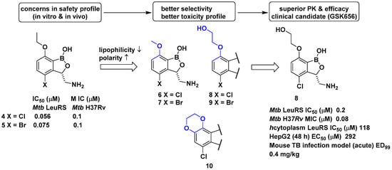 In a related study, GlaxoSmithKline (GSK) developed a series of 3-aminomethylbenzoxaborole derivatives 4 and 5 that target Mycobacterium tuberculosis (Mtb) LeuRS []. The boron atom in the molecules was critical for Mtb LeuRS activity since it forms a bidentate covalent adduct with the terminal nucleotide of tRNA, Ade76, and traps the 3′ end of tRNALeu in the editing site to inhibit leucylation and thus protein synthesis. The (S)-aminomethyl side chain at C-3 in 4 and 5 was critical for binding, and C-4 halogen atoms (Cl and Br) significantly improved Mtb LeuRS activity, antitubercular activity against Mtb H37Rv, and selectivity against other bacteria. However, potential toxicity issues from the inhibition of mammalian cytoplasmic LeuRS and tolerance issues of 5 in a once daily dose of 50 mg/kg in a mouse acute tuberculosis (TB) infection model caused serious concerns for its use as a TB drug in long-term therapy. Throughout a series of medicinal chemistry campaigns to examine the structure–activity relationship (SAR) of 3-aminomethylbenzoxaborole derivatives, compounds 6–10 were found to improve both selectivity against human cytoplasmic LeuRS and HepG2 cell toxicity compared with 4 and 5, presumably by decreased lipophilicity and increased polarity in the molecule (Figure 4) []. Triaging lead compounds through in vivo pharmacokinetic (PK) analysis and efficacy assays using acute and chronic mouse TB infection models identified 8 (GSK656) as a preclinical candidate for tuberculosis; 8 successfully completed its first-time-in-human (FTIH) study to evaluate the safety, tolerability, pharmacokinetics, and food effects of single (5, 15, and 25 mg) and repeat oral doses (5 and 15 mg, 14 days, qd [quaque die, once a day]; NCT03075410) []. Moreover, 8 is currently in a phase 2 clinical trial for drug-sensitive pulmonary tuberculosis to evaluate its early bacterial activity, safety, and tolerability (NCT03557281). Details of the clinical studies of 8 will be discussed in a later section.