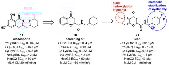 Another medicinal chemistry campaign to develop a new antimalaria and anti-cryptosporidiosis drug targeting Pf LysRS1 and Cryptosporidium parvum (Cp) LysRS was continued by Baragaña et al. using cladosporin as a starting point []. Its low druggability due to high metabolic instability was optimized by replacing the isocoumarin core with the chromone scaffold connected to a metabolically stabilized cyclohexane ring with an amide linker, as shown in Figure 6. Compound 21 was active against both Pf LysRS1 (IC50 = 0.015 μM, luciferase ATP consumption assay) and whole-cell bloodstream P. falciparum 3D7 (EC50 [the half maximal effective concentration] = 0.27 μM) and was selective compared with human (Hs) LysRS (IC50 = 1.8 μM). The pharmacokinetic properties were optimized by stabilizing the metabolically labile cyclohexyl ring and blocking the point of potential hydroxylation of the phenyl group in the chromone core. As a result, compound 21 showed good systemic exposure with excellent oral bioavailability (F = 100%) and a moderate half-life (t1/2 = 2.5 h). In vivo efficacy was evaluated using a NODscidIL2Rγnull mouse (SCID) model and doses up to 40 mg/kg (po [per os, oral administration]), and it was found that a daily oral dose of ED90 = 1.5 mg/kg (1.0–2.3 mg/kg) (estimated daily exposure in blood AUCED90 [area under the curve at ED90] = 11,000 ng·h/mL/d (6900–14,000 ng·h/mL/d)) reduced parasitemia by 90%. A high level of sequence identity within the active site region of Pf LysRS1 and Cp LysRS (96% identity) and an overall sequence identity of 47.7% and similarity of 64.6% across the entire protein was observed from the evaluation of compound 21 against Cryptosporidium parvum both in vitro and in vivo. Compounds for cryptosporidiosis treatment must also have good exposure in the gastrointestinal tract and possibly also some systemic exposure since the parasite is found predominantly in the gastrointestinal tract with some in the biliary tract. In this regard, compound 21 was worthy of consideration for cryptosporidiosis since 17% of the oral dose was found in mouse stools, suggesting that some biliary excretion had occurred. Compound 21 showed efficacy in vivo in two different Cryptosporidium mouse models, NOD SCID gamma and INF-γ-knockout, at 20 mg/kg (po). However, the toxicity concern of 21 at 50 mg/kg in mice (po) at which the blood concentration in mice reached the EC50 for HepG2 cells limited further development. It is presumed that the toxicity is due to the inhibition of mammalian LysRS.