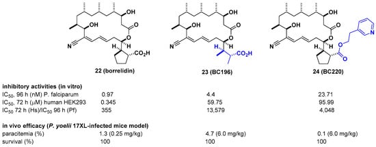 Borrelidin is known as a potent inhibitor of threonyl-tRNA synthetase (ThrRS) for malaria. However, its lack of selectivity against human ThrRS and high toxicity to human cells limit further development as a drug candidate. In this regard, Novoa et al. derived a series of borrelidin analogs that circumvent these potential problems by showing higher selectivity and lower cytotoxicity from minor structural changes in the carboxylic acid side chain []. In particular, compound BC196 (23), which released rotational constraints by adopting linear carboxylic acid, and compound BC220 (24), which converted terminal carboxylic acid to pyridyl ethyl ester on the cylcopentane ring, showed improved selectivity against P. falciparum over human HEK293 cells by 13,579-and 4048-fold, respectively. Considering that borrelidin exhibited 355-fold activity difference between P. falciparum and human HEK293 cells, selectivity was improved by 11–38-fold. From in vivo efficacy studies using a Plasmodium yoelii 17XL-infected mouse model, 23 and 24 showed 100% survival over 20 days after drug treatment at 6 mg/kg per day. In particular, 24 showed complete clearance of parasites in the blood at 6 mg/kg per day, 80% survival, and ~3% parasitemia at 0.25 mg/kg per day. It is also interesting that 24 was not cleaved to borrelidin by esterase, as determined in time course experiments with infected red blood cells (RBCs) over 27 h, suggesting that the biological effect of 24 is not due to its conversion to borrelidin by RBCs or plasmodial esterases (Figure 8).