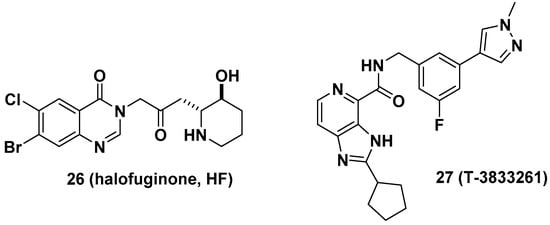 Halofuginone (HF, 26), a well-known antifibrotic agent in preclinical and clinical studies, inhibits prolyl-tRNA synthetase (ProRS) activity []. Mechanistically, 26 competitively binds to the proline-binding pocket of the catalytic site of ProRS and causes drug resistance due to the accumulation of proline []. It is anticipated that the antifibrotic effect of 26 would be diminished in fibrotic tissue because a higher concentration of proline is often observed in fibrotic tissue than in nonfibrotic tissue []. In this regard, Shibata et al. from Takeda Pharmaceuticals developed T-3833261 (27), a potent ATP competitive inhibitor of ProRS that does not bind to the proline-binding site []. The antifibrotic activity of 27 was evaluated both in vitro and in vivo. From the transforming growth factor beta (TGF-β)-induced fibrotic assay, 27 inhibited the expression of fibrotic markers, including α-smooth muscle actin (α-SMA) and type I collagen (Col1a), by reducing mothers against decapentaplegic homolog 3 (Smad3) expression in human skin fibroblasts. These results were directly correlated with the in vivo TGF-β-induced mouse model. The topical application of 27 reduced the expression of fibrotic genes such as Col1a1, Col1a2, and α-SMA (Figure 10).