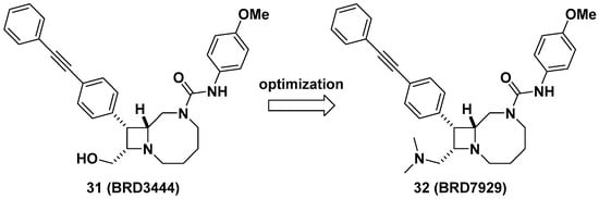 Lastly, Kato et al. reported bicyclic azetidines such as 31 and 32 (Figure 12) as potent inhibitors of Pf phenylalanyl-tRNA synthetase (PheRS) (EC50 = 9 and 5 nM, respectively, against a multi-drug resistant strain, Pf Dd2) for the treatment of malaria []. Lead optimization campaign allowed the improvement of in vitro potencies of 31 against Plasmodium cynomolgi (EC50 = 3.34/2.86 μM for small form [SF, hypnozoite-like]/large form [LF, schizont], respectively), P. falciparum liver-stage (EC50 = 1.31 μM), and P. falciparum transmission-stage, gametocyte IV–V (EC50 = 663 nM) to EC50 = 0.933/1.04 μM (for SF/LF), 0.34 μM, and 0.16 μM in 32, respectively. Issues in 31 such as poor solubility (<1 μM in PBS), high clearance in human and mouse liver microsomes (Clint = 142 and 248 μL/min/mg, respectively), and a high volume of distribution in vivo (12 L/kg) were optimized by replacing the hydroxymethyl of 31 to N,N-dimethylaminomethyl group in 32 to give improved solubility (15 μM in PBS), decreased clearance in human and mouse liver microsomes (Clint = 31 and 21 μL/min/mg, respectively), and a better volume of distribution in vivo (24 L/kg), resulting in a longer half-life (32 h) which can be suitable for single-dose oral treatment. In vivo efficacy studies of 32 in multiple stages of malaria models including Plasmodium berghei CD-1 and P. falciparum huRBC NSG mouse models showed complete elimination of blood- and liver-stage parasites by a single dose during the study period. This study has served as an example of developing a cure for malaria as well as the potential to give prophylaxis and prevent disease transmission. Additionally, Vinayak et al. reported that bicyclic azetidine 32 is a potent inhibitor of Cryptosporidium parvum PheRS (Cp PheRS) for diarrheal disease in young children []. The in vivo efficacy of 32 for cryptosporidiosis was shown in immunosuppressed mouse models. Overall, it is thought that bicyclic azetidines such as 32 possess a unique core skeleton and warrant further examination to exploit their chemical space for applications not only in infectious diseases, but also for other diseases.