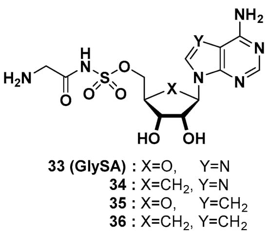 Professors Schimmel and Yang at the Scripps Research Institute disclosed four different glycylsulfamoyladenosine derivatives (GlySAs, Figure 13) as human glycyl-tRNA synthetase (GlyRS) inhibitors for cancer therapy by lowering neddylation []. The covalent attachment of NEDD8 (neuronal precursor cell-expressed developmentally downregulated gene 8) to the core cullin protein of cullin-RING ligase E3s (CRLs, e.g., Ubc12), called neddylation, is a crucial process for the ubiquitination of multiple protein substrates mediated by GlyRS. GlyRS is highly expressed in most malignant cancers, such as breast cancer, ovarian cancer, and lung cancer. Selective binding of GlySAs to the catalytic domain of human GlyRS inhibited the attachment of NEDD8, consequently reducing the level of neddylation by more than 50% in various cancer cells. The patent provided the systematic mode of action (MOA) evaluation of GlyRS in the neddylation pathway and the confirmation of GlyRS inhibition with the crystal structure of GlySA (33) binding to human GlyRS (PDB code: 2ZT8). GlySAs were screened with the NCI 60 cell panel assay at a single dose of 5–10 M, and GlySA (33) showed a range of growth inhibition values (GI50 = 0.372–3.715 μM) in 58 cancer cell lines. With the lung metastasis model induced by MDA-MB-231 cells, 33 was administered via intravenous injection twice a week at a dose of 4 mg/kg (n = 10). After 10 days of injection of GlyRS inhibitors, 33 reduced lung metastases in the mouse model with 69% efficacy, which was greater than that (4.4 mg/kg, 40% efficacy) of MLN4924. MLN4924, an inhibitor of NEDD8-activating enzyme (NAE), is under development for various types of tumors in a clinical setting [].