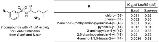 Jirgensons et al. at the Latvian Institute of Organic Synthesis developed N-aminoacyl-arylsulfonamide derivatives as aminoacyl-tRNA synthetase (ARS) inhibitors for the treatment of bacterial infections [,]. Arylsulfonyl chlorides were converted to the corresponding arylsulfonamides, in which the terminal amine was coupled with amino acids to provide 52 compounds of N-aminoacyl-arylsulfonamides, as shown in Scheme 1. All compounds were tested for in vitro enzyme inhibition assays against leucyl-, valyl- and isoleucyl-tRNA synthetases (LeuRS, ValRS, and IleRS, respectively) from E coli and S. aureus and showed IC50 values from 0.0034 to >50 μM for E. coli LeuRS and from 0.26 to >50 μM for S. aureus LeuRS. However, none of the compounds presented any inhibitory activities at concentrations of 50 μM or below against IleRS and ValRS bacterial enzymes from either E. coli or S. aureus. Therefore, the scope of substituents on the phenyl ring was investigated further. It was found that the compounds bearing a meta-substituted phenyl ring as well as a leucine moiety presented a significant increase in the inhibition of LeuRS from E. coli and S. aureus with submicromolar activity (Figure 15) (e.g., IC50 values of compound 42: 0.002 μM for E. coli LeuRS and 0.33 μM for S. aureus LeuRS).