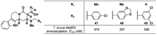 The Martin group at the University of Texas at Austin reported T. brucei methionyl-tRNA synthetase (MetRS) inhibitors for the treatment of African trypanosomiasis and sleeping sickness [,]. Two major classes of compounds incorporating tetracyclic tetrahydro-beta-carboline and 4-amino-2-piperidone were prepared to selectively inhibit the MetRS of T. brucei. The inhibitory activities of three tetracyclic carboline compounds (47–49) were tested for the T. brucei MetRS aminoacylation assay, showing submicromolar IC50 values as depicted in Figure 17. One of the tetracyclic compounds exhibited no off-target activity when screened against a panel of 45 CNS proteins.