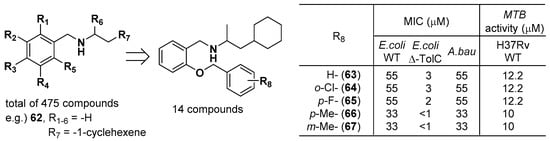 The Kahne group at Harvard University developed tRNA synthetase inhibitors of secondary amines for killing Gram-negative bacteria and treating tuberculosis []. Although the target enzyme is not specifically mentioned in their patent, phenylalanyl-tRNA synthetase (PheRS; FARS, formerly FRS) might have been explored due to the specific note about FRS in the table of antimicrobial activity. They synthesized 458 secondary amines, one tertiary cyclic amine, 15 tertiary cyclic amides, and one tertiary cyclic carbamate compound. The antimicrobial activities of each compound were measured via the Gram-negative (E. coli and Acinetobacter baumannii (A. bau)) MIC protocol and tuberculosis luminescence assay. Among these compounds, the methyl substitution of R6 and ortho substitution of R5 on the secondary benzylic amine significantly increased the antimicrobial activities (Figure 18). In particular, the para- or meta-methyl substitution of R8 provided the most potent antimicrobial compounds, 66 and 67, with MIC values of 33 μM (E. coli WT), less than 1 μM (E. coli Δ-TolC), and 33 μM (A. bau) against Gram-negative bacteria as well as Mycobacterium tuberculosis (MTB) activity of 10 μM against H37Rv WT. Furthermore, they showed that combination treatment of compound 62 (R1-6 = -H, R7 = -1-cyclohexene, HCl salt) and AN3365 (an LeuRS inhibitor) dramatically decreased the viability of bacterial cells, suggesting that the combination therapy could attenuate antibiotic resistance, thus expanding the lifespan of antibiotics.