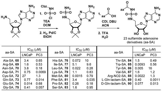 The Qi group at the University of Florida prepared 23 sulfamide adenosine derivatives as aminoacyl-tRNA synthetase inhibitors for the treatment of proliferative diseases such as cancers, inflammatory diseases, and autoimmune diseases []. As described in Figure 20, a protected adenosyl amine was extended as the protected adenosyl sulfamide, of which the terminal amine was coupled with the different kinds of amino acids to complete the synthesis of the aminoacyl sulfamide adenosine compounds (aa-SA). The cell viability assay of the aa-SAs was performed in prostate cancer cell lines, and IC50 values of 0.0015–27 μM for LNCaP and 0.0011–16 μM for PC3 were observed.
