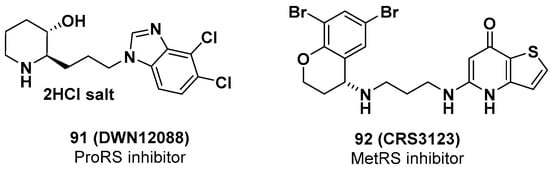 Excessive deposition of collagen is pathologically considered to be the main cause of fibrosis, and proline residues are the major constituents of collagen. Therefore, an eProRS inhibitor would downregulate collagen synthesis and would be a potential therapeutic agent against fibrosis. Daewoong Pharmaceutical Co. Ltd. developed DWN12088 (91) (Figure 21), one of the class A compounds (eProRS IC50 = 78 nM) covered in the aforementioned patent (WO 2018147626 A1), for the treatment of idiopathic pulmonary fibrosis (IPF). In IPF patient-derived primary lung fibroblasts, treatment with 91 reduced the synthesis of collagen and α-smooth muscle actin (α-SMA) under transforming growth factor-β (TGF-β) induction. In the mouse model of bleomycin-induced pulmonary fibrosis, oral administration of 91 for 2 weeks significantly reduced cardiac fibrosis (ED50 = 0.4 mg/kg, in vitro) and the collagen amount in lung tissues and bronchoalveolar lavage fluid (BALF) []. Remarkably, 91 provided considerable repair of lung function in this mouse model, as measured by whole-body plethysmograph. GLP (good laboratory practice) toxicity studies of 91 with a 4-week repeated dose in rats and monkeys were conducted to examine a wide safety margin. Furthermore, 91 was designated an orphan drug for IPF by the FDA in August 2019 [], and a phase I clinical trial (a randomized, parallel-assignment, double-blind, placebo-controlled; ACTRN12619001239156) began in Australia in September 2019. The goal of the study was to assess the safety, tolerability, and pharmacokinetic properties of single- and multiple-ascending doses of 91 compared with placebo following oral administration in healthy volunteers (expected n = 80) []. The study was conducted in two parts: part A (single-ascending dose, six cohorts, eight subjects/cohort) and part B (multiple-ascending dose, four cohorts, eight subjects/cohort). In part A, two subjects in each cohort received placebo, and six subjects received a single dose (100 mg, 200 mg, 500 mg, or 800 mg) of 91. In part B, two subjects in each cohort were given placebo, and six subjects received multiple doses (25 mg, 75 mg, 150 mg, or 300 mg) every 12 h for 14 days. The safety and tolerability of 91 patients were evaluated in each cohort prior to dose escalation. Blood samples for PK and PD (pharmacodynamics) analysis were collected at certain time points from the pre-dose of 91 through 72 h post-dose. The preliminary results showed that human ProRS was significantly overexpressed compared with normal lung tissue from IPF patients []. This phase I study was expected to be completed in October 2020, and more detailed clinical results are expected to be reported soon.