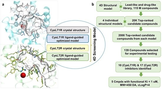 Overview of the prospective VLS for CysLTRs. (a) Optimized ligand pockets for CysLT1R (blue) and CysLT2R (green) and the composition of the 4D Screening model. Key water in the optimized pocket of CysLT1R and CysLT2R is shown by red sphere. (b) Flowchart of screening and ligand identification procedure.