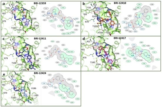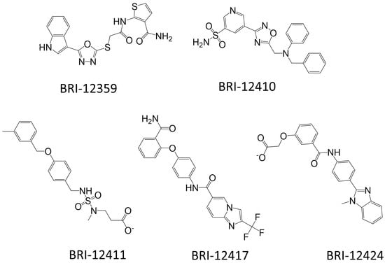 The potencies of the best compounds at inhibiting the agonist-induced response were tested in the antagonist mode at concentrations ranging from 1.5 to 100 µM. For the CysLT1R, five hits with robust dose response were identified: BRI-12359, BRI-12410, BRI-12411, BRI-12417, and BRI-12424. Their chemical structures are provided in Figure 2. Of these, BRI-12359 and BRI-12417 were able to completely inhibit the agonist-mediated response, with BRI-12359 being the more potent of the two (Figure 3a; Table 2). As shown in Table 2, the identified hits display sub-micromolar or low micromolar Ki values in inhibiting LTD4-mediated IP1 production. These functional Ki values were calculated using the Cheng-Prusoff equation. Compounds BRI-12410, BRI-12411, and BRI-12424 showed partial antagonism with Ki values in the 0.2 to 0.7 µM range. For CysLT2R, only BRI-12359 fully abolished the LTD4-induced response (Ki = 6.46 ± 0.43 µM), while BRI-12417 displayed partial inhibition (54 ± 6%) at 100 µM (Supplementary Table S1 and Figure S3).