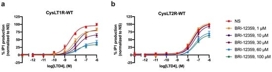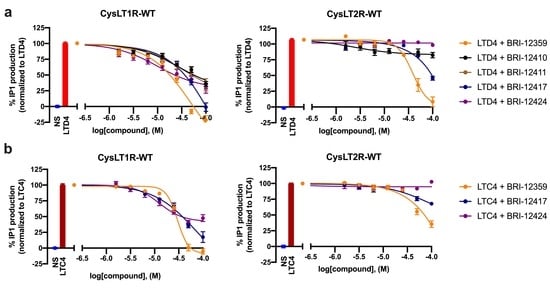 Considering that LTC4 is another prominent endogenous leukotriene that activates both CysLT1R and CysLT2R, we tested the three most promising hits (BRI-12359, BRI-12417 and BRI-12424) in the IP1 assay using LTC4 as agonist. As one can see in Figure 3b, the compounds showed similar profiles with LTC4 vs LTD4 at the CysLT1R, with even slightly better sub-micromolar potencies (Ki = 0.7 ± 0.2 µM for both BRI-12417 and BRI-12359). However, BRI-12359 and BRI-12417 were less effective at inhibiting the LTC4-induced response at CysLT2R at the EC80 concentration of LTC4 (Table 2), and their Ki values could not be calculated.