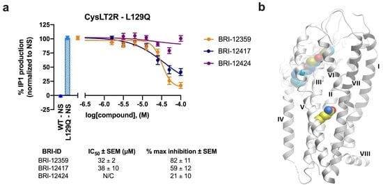 Given the efficient antagonism of the novel BRI-12359, BRI-12417 and BRI-12424 compounds, we hypothesized that these compounds might also inhibit receptor signaling at constitutively active CysLTR mutants, thereby acting as inverse agonists. This effect would be particularly interesting in the case of the L129Q CysLT2R mutant identified in uveal melanoma patients [,,,]. We tested these three compounds in the functional IP1 assay using cells transiently expressing the L129Q CysLT2R mutant, directly stimulated with a range of compound concentrations (1.6 to 100 μM). As can be seen in Figure 5, the IP1 accumulation caused by signaling of the constitutively active CysLT2R L129Q mutant was reduced in cells stimulated with BRI-12359 and BRI-12417. This reduction was concentration-dependent, with potencies (IC50) in the 30 to 40 μM range, where BRI-12359 shows practically full inhibition of the IP1 production by CysLT2R L129Q mutant at a 100 μM concentration.