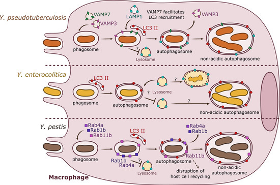 Summary results from independent studies of autophagy induction by Y. pseudotuberculosis, Y. enterocolitica, and Y. pestis in macrophages. Y. pseudotuberculosis (top) recruits VAMP3 and VAMP7 to the YCV early in the invasion process. VAMP7 facilitates the recruitment of LC3-autophagic membranes, forming an autophagosome with double or multiple membranes. Rab1b (not represented) is important for bacterial survival. Y. pseudotuberculosis survives and replicates in a non-acidic autophagosome. Y. enterocolitica (center) is present in a double- or multiple-membrane autophagosomal compartment positive for LC3. Depending on the strain and its pathogenicity, Y. enterocolitica seems to survive in autophagosomes. Y. pestis (bottom) targets Rab GTPases (1b, 4a, 11b) to the phagosome. Rab1b and Rab4a participate in the inhibition of acidification and thus are involved in bacterial survival. Rab11b is sequestered to the autophagosome over the course of infection, which leads to a global inhibition of host endosomal recycling. Y. pestis proliferates in a non-acidic autophagosome.