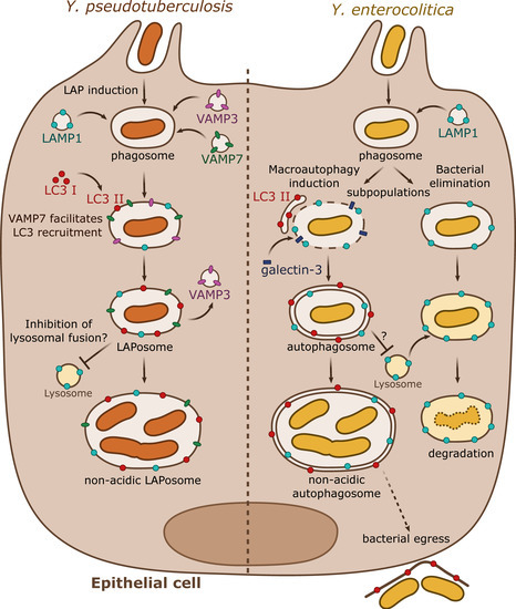 As demonstrated in macrophages, a subsequent study by the same group described that in epithelial HeLa cells, Y. pseudotuberculosis also activates autophagy (Figure 2) [39]. In these epithelial cells, Y. pseudotuberculosis inhibits the maturation of YCVs, favoring bacterial proliferation in non-acidic compartments. However, and by contrast to what occurs in BMDMs, in HeLa cells, the non-conventional autophagic pathway LAP is engaged with direct recruitment of LC3 proteins to the YCVs. This process triggers the formation of a single-membrane niche for bacterial replication called LAPosome. Fluorescent microscopy experiments then revealed that VAMP3 and VAMP7 are sequentially recruited to the YCVs in both BMDMs and HeLa cells. siRNA inactivation assays demonstrated that VAMP7 facilitates the recruitment of LC3 to YCVs. Interestingly, VAMP3 is found in a higher proportion in YCVs in HeLa cells than in BMDMs. A combination of overexpression and siRNA experiments demonstrated that VAMP3 controls a checkpoint at which bacteria are committed to single LC3-positive compartments [39].
