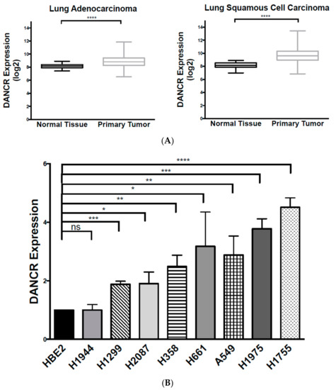 DANCR expression was significantly increased in a panel of NSCLC cell lines, with the exception of H1944. The H1944 cell line could have developed and progressed from different mutations than those of the other lines, and DANCR overexpression was thereby unnecessary for its survival and growth. Further analysis of hundreds of NSCLC samples compared to normal lung tissue from the TCGA dataset demonstrated that DANCR is highly upregulated in NSCLC.