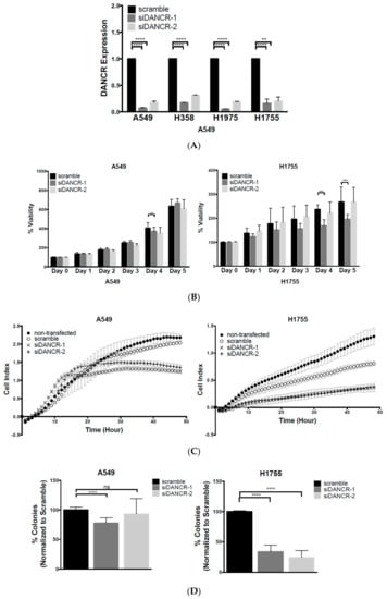 The difference in the effect of DANCR KD on long-term growth between A549 and H1755 may be due to inherent differences between the two cell lines. H1755 cells were derived from a metastatic lesion of adenocarcinoma, while A549 cells originated from a primary adenocarcinoma tumor. Moreover, our experiments revealed a nearly twofold increase in DANCR expression in H1755 compared to that in A549 (Figure 1B). As our analysis of TCGA data (Figure 1A) and previous reports suggested, increased DANCR expression is associated with poorer prognosis, and may potentially be related to more aggressive cancer types [,,,,,,,]. Therefore, higher DANCR expression in H1755 could have played a critical role in the pathogenesis of the originating H1755 lesion. This may explain why inhibition of DANCR expression produced a more significant effect on long-term growth.