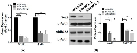 Cells that exhibit migratory capacity possess phenotypic similarities with the cancer stem cell (CSC) subpopulation. Stem-like programs are regulated by the timing and expression patterns of multiple markers. To investigate the effect of DANCR KD on stem-like characteristics, we evaluated the expression of two fundamental CSC markers, SOX2 and ALDH1/2. We found that transient DANCR KD significantly reduced SOX2 and ALDH mRNA, and protein expression compared to scramble control (Figure 3A,B).