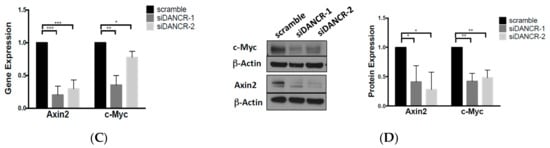 The canonical Wnt/β-catenin pathway was shown to promote cancer cell proliferation, invasion, and stemness in many types of cancers including colorectal, breast, and leukemia []. We analyzed the impact of DANCR on β-catenin signaling activation with a luciferase-reporter assay using the β-catenin reporter Super 8X-TOPFlash plasmid, which contains TCF/LEF sites upstream of a luciferase reporter. Transient knockdown of DANCR expression in A549 cells with shRNAs reduced luciferase activity by approximately 50% compared to the control shRNA (Figure 4A and Figure S1E). We then assessed changes in Wnt signaling molecules, and found that the transient KD of DANCR reduced β-catenin protein expression (Figure 4B). We further explored the expression of downstream Wnt target genes Axin2 and c-Myc, and found that both mRNA and protein expression were downregulated upon DANCR KD (Figure 4C,D). Together, these results indicated that DANCR regulates Wnt/β-catenin signaling.
