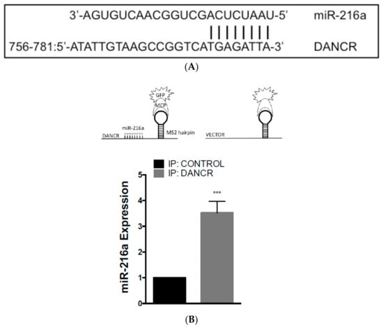 LncRNAs have multiple properties, which include their ability to act as competitive endogenous RNA (ceRNA). CeRNAs are able to inhibit miRNA activity by competitively binding miRNAs through miRNA recognition elements (MRE), resulting in inhibition of miRNA–mRNA binding and the upregulation of the miRNA targets. Using in silico analysis, DANCR was predicted to contain an MRE site for miR-216a (Figure 5A). Previous reports showed that miR-216a reduced migration and invasion in glioma, and colorectal and pancreatic cancer [,,]. Additionally, Wang, RT et al. reported that miR-216a was downregulated in NSCLC, which promoted NSCLC growth, invasion, and metastasis in mice [].