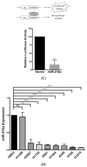 Noncoding RNAs (ncRNAs) are critical regulators of gene expression that are commonly dysregulated in cancer. MicroRNAs (miRNAs) are small ncRNAs that are 16–24 nucleotides long, and function post-transcriptionally by binding to target mRNAs at specific recognition sequences, leading to target mRNA degradation or translational repression. Several miRNAs have been shown to play important regulatory roles through the promotion or suppression of NSCLC []. In particular, miR-216a was described as an inhibitor of NSCLC cell growth, invasion, and metastasis []. However, the direct mechanism by which miR-216a expression is regulated in NSCLC has not been defined.