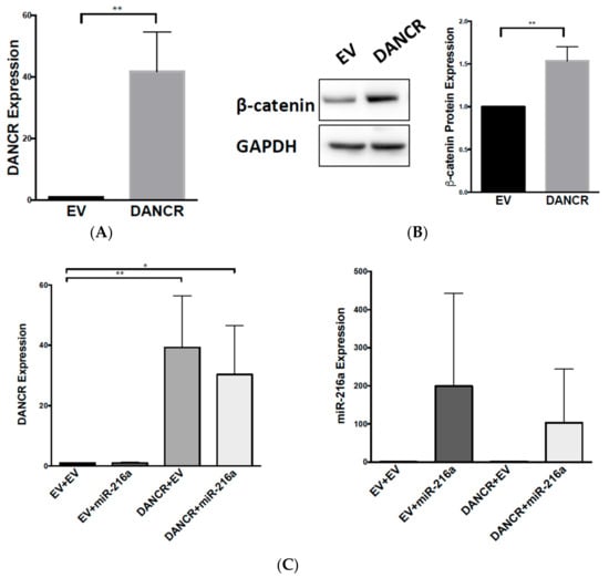 DANCR promotes Wnt/β-catenin signaling through miR-216a inhibition. (A) qRT-PCR measuring fold change of DANCR expression in A549 cells transfected with pBABE-DANCR compared to vector control (n = 3; t test, ** p < 0.001); (B) fold change of β-catenin protein expression in A549 DANCR overexpressing cells (n = 3, t test, ** p < 0.001); (C) (left) qRT-PCR measuring fold change of DANCR expression in A549 cells doubly transfected with vector + vector (EV + EV), vector + pBABE-miR-216a (EV + miR-216a), vector + pBABE-DANCR (EV + DANCR), or pBABE-DANCR + pBABE-miR-216a (DANCR + miR-216a); (right) qRT-PCR measuring fold change of miR-216a expression (n = 4, t test, * p < 0.05, ** p < 0.001); (D) fold change of β-catenin protein expression in A549 cells doubly transfected with vector + vector (EV + EV), vector + pBABE-miR-216a (EV + miR-216a), vector + pBABE-DANCR (EV + DANCR), or pBABE-DANCR + pBABE-miR-216a (DANCR + miR-216a) (n = 4, t test, * p < 0.05).