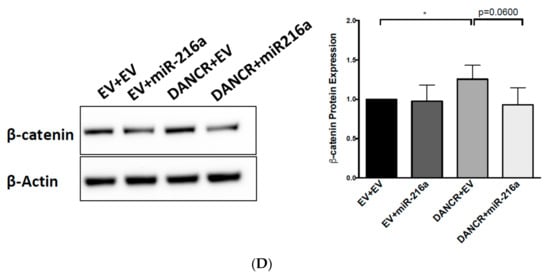 After verifying the competitive binding of DANCR and miR-216a, we hypothesized that DANCR could be regulating Wnt/β-catenin via miR-216a repression. To test this, we overexpressed DANCR by transfecting A549 cells with a DANCR cDNA vector. An increase in DANCR expression was detected 48 h after transfection (Figure 6A), which increased β-catenin protein expression compared to that in vector control cells (Figure 6B). After the first round of DANCR transfection, cells were expanded and transfected again with a vector control or miR-216a plasmid. We confirmed the overexpression of DANCR and miR-216a (Figure 6C). Western blot analysis revealed DANCR and vector-transfected cells increased β-catenin protein expression compared to vector and vector control cells, and the combination of DANCR and miR-216a decreased β-catenin expression. We consistently observed a decrease in β-catenin expression with the coexpression of DANCR and miR-216 compared to DANCR alone, although the decrease did not reach statistical significance (p = 0.06), lending support to our hypothesis that miR-216a regulates β-catenin (Figure 6D). These results suggested an interplay among DANCR, miR-216a, and β-catenin, and indicated that DANCR activates Wnt/β-catenin signaling through miR-216a repression.