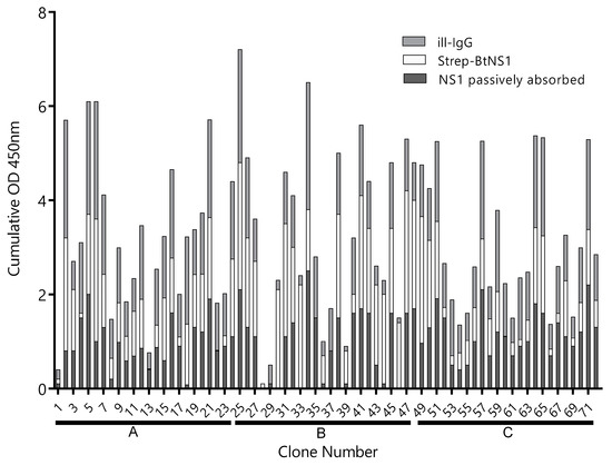 Reactivity of clones selected by different strategies. The supernatant of 24 Nb clones selected using the A, B, and C panning conditions—clones 1–24, 25–48, and 49–72, respectively—were tested by ELISA on plates coated with Zika virus NS1 (ZVNS1) immobilized using the A (dark gray), B (light gray), or C (gray) strategies. ill-IgG: immune llama immunoglobulin G and BtNS1: biotinylated NS1. Optical density at 450nm (OD450nm) was measured.