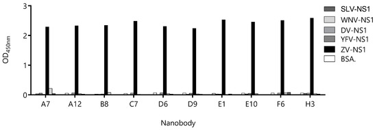 Evaluation of the cross-reactivity of the detection-nanobody candidates against different flavivirus NS1 proteins. Nanobodies were exposed to wells sensitized with 1.0 µg of NS1 from Zika Virus (ZV), Dengue Virus (DV), Yellow Fever Virus (YFV), West Nile Virus (WNV). Bovine serum albumin (BSA) was used as the negative control.