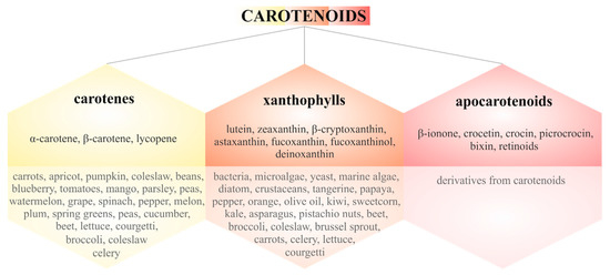 Carotenoids can be classified into two groups according to the presence or absence of oxygen in their molecules. Hydrocarbon carotenoids without oxygen in their molecules, such as α-carotene, β-carotene, and lycopene, are collectively called carotenes, which are commonly found in the human diet [20,83].