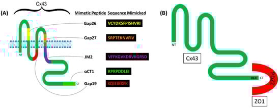 To date, 21 different connexin genes have been identified in the human genome, though only Cx37, Cx40, Cx45 and Cx43 have been found in the vascular endothelium specifically [21]. The most ubiquitously expressed isoform is Cx43 [22]. Cx43 is a 382 amino acid (aa) long polypeptide comprised of four conserved α-helical transmembrane domains, two extracellular loops, a cytoplasmic loop, and cytoplasmic amino (N)- and carboxyl-terminal (CT) domains. The N-terminus (NT) is relatively short (13 amino acids), while the CT is relatively long (w/150 amino acids). Multiple regions along its length have been utilized as peptide sequences for a variety of Cx mimetic peptides such as αCT1, Gap19, Gap26, and Gap 27 (Figure 1A). The C-terminal (CT) of Cx43 (as well as other connexins) is highly disordered, flexible, and modifiable in its interactions with tight junction adaptor Zonula occludens 1 (ZO1) [23,24,25].