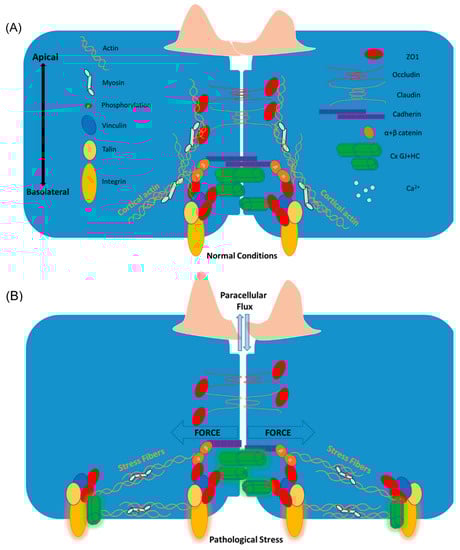 Multicellular organisms possess junction-based cellular barriers [1]. Barrier function is a vital homeostatic mechanism characterized by the regulatory exchange of substances between interior and exterior compartments of epithelial tissues, marked by apical and basolateral membrane domains, respectively. Vertebrate epithelial tissue, including its specialized form, the endothelium, is composed of barrier cells, which are defined by the presence of Zonula occludens-containing junctional complexes [2,3]. Pathological stress-induced breakdown in the barrier properties of these junctions is often triggered by a release of inflammatory mediators, which cause dynamic changes in cytoskeletal organization and mechanical force transmission at bicellular and tricellular contact points. These changes result in an unregulated, disruptive exchange and buildup of fluid, ions and other solutes, as well as immune cell infiltration across multiple tissue types and disease processes. Barrier function-associated diseases include Coronary Artery Disease (CAD), Stroke, Acute Respiratory Distress Syndrome (ARDS), Inflammatory Bowel Disease (IBS), and Multiple Sclerosis [4,5,6,7,8,9,10,11]. Barrier-modulating cellular structures include (1) tight junctions (TJ), which provide a gating mechanism that directly controls the exchange of substances across the paracellular space; (2) adherens junctions (AJ), which are critical for the establishment and maintenance of cell-cell adhesion; (3) the actin cytoskeleton, which controls the overall integrity of cell-cell contacts via mechanical push/pull forces; and (4) gap junctions (GJ), which allow for exchange of signaling molecules and ions between cells through connexin-based transcellular channels, in addition to close points of intercellular adhesion. While traditionally considered to be independent structures, evidence indicates a high degree of crosstalk amongst these different cellular complexes, including via a shared, direct interaction with the tight junction scaffolding molecule, Zonula occludens 1 [12,13,14,15].