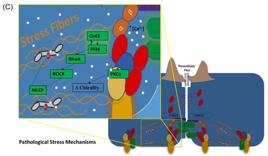 Potential channel-independent and -dependent roles for Cx43 in the dynamics of focal adhesions and barrier function-associated actin structures extend further. Focal adhesions are mechanosensory complexes that respond to stress/strain signals from the environment via integration with actin cytoskeletal structures [198]. Cx43-based channel activity has been implicated in mechanosensing in multiple studies [199]. In osteocytes for instance, Cx43 HCs open en masse in response to fluid flow and were experimentally determined to mediate the effects of mechanical stimulation [200]. Not surprisingly, multiple studies have implicated PKCα in transduction of mechanical stimulation of osteoblast cells [201,202]. A study by Batra and colleagues [176] showed that PI3K signaling resulted in shear stress-induced conformational activation of α5β1 integrin. Moreover, PI3K activation in this study triggered an interaction between α5β1-integrin and Cx43, resulting in the opening of Cx43 HCs. A recent study reporting in silico (computational and mathematical), ex vivo, and in vitro evidence of scar formation demonstrated that αCT1 may render cells insensitive to biomechanical inputs during scar differentiation [203]. Computational modeling predicted that αCT1′s alteration of collagen organization, resulting from its effects on fibroblast migration characteristics (as fibroblast secrete collagen), occurs in a mechanically-sensitive manner. αCT1-treated fibroblasts exhibited random directionality of migration as well as alteration in tail retraction during cell migration. Actin SF formation and contraction are required for tail retraction during directional migration [204,205]. Thus, all evidence considered, it appears that the HC-dependent activity of Cx43 and/or an intact Cx43/ZO1 interaction at focal adhesions might support actin SF formation and alignment. The intimate link between Cx43 and actin could ultimately regulate the actomyosin pulling forces exerted through ZO1 as tension transducer, onto AJ and TJ-based cell-cell contacts in a PI3K/PKCα-dependent manner. An integrative model for potential channel-dependent and -independent roles of Cx43 in actin-mediated barrier function pathology is proposed in Figure 3 (Figure 3A–C). Future experiments might directly investigate a potential role of Cx43 in a PI3K-mediated, cytoskeletal-associated modulation of barrier function.