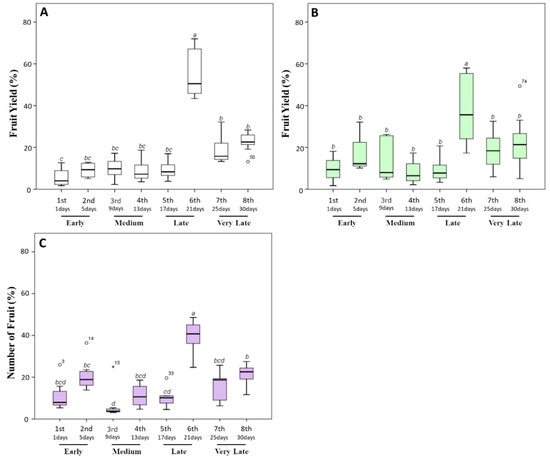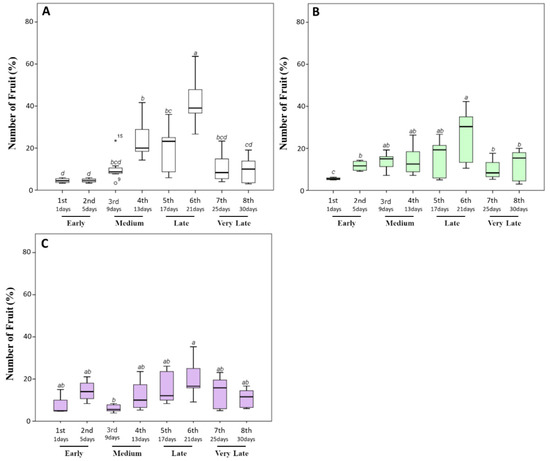 Fruit percentage (%) produced by tomato plants during the harvesting time (30 days). After the appearance of the first ripe fruits, the fully red-colored fruits were harvested every 4 days. (A) The percentage of fruit number harvested from untreated plants. (B,C) Those harvested from plants treated with a triple or a quadruple dosage of biostimulant, respectively. Within the same panel, the different lowercase letters on the top of each boxplot indicate significant differences at p ≤ 0.05, as measured by Tukey’s multiple range test. The letter “a” denotes the highest value. For additional statistical analysis information, see Table S1.
