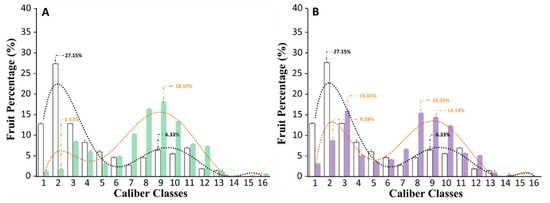 Size of the fruits produced by untreated tomato plants, or treated with a triple or quadruple dosage of biostimulant. (A) The fruit caliber of plants that were non-treated (grey) versus plants treated with a triple dosage (green) of biostimulant. (B) The fruit caliber of non-treated plants (grey) versus plants treated with a quadruple dosage (violet) of biostimulant. For each panel, the dotted line shows the distribution trend of fruit size (untreated = black; treated with the biostimulant = orange). The x-axis reports the caliber classes in which the fruits have been grouped according to their external diameter. The caliber classes and the external diameter of each group is reported in Table S2.