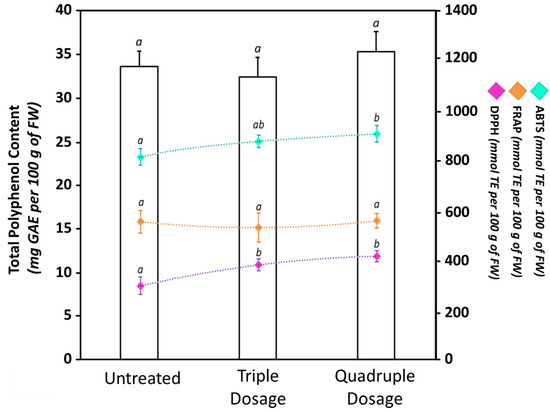 Total polyphenol content (TPC), radical scavenging activity (2,2’-azino-bis(3-ethylbenzothiazoline-6-sulphonic acid (ABTS) and 2,2-diphenyl-1-picrylhydrazyl (DPPH)), and ferric reducing antioxidant power (FRAP) of untreated and biostimulant-treated tomato fruits. The bars show the TPC measured by Folin–Ciocalteu assay; meanwhile, the points indicate the antioxidant properties measured by ABTS (light-blue), DPPH (violet), or FRAP (orange). Values are expressed as mean ± standard deviation (SD) of three experiments. Within the same dataset, different lowercase letters indicate significant differences at p ≤ 0.05 as measured by Tukey’s multiple range test. The letter “a” denotes the lowest content. For additional statistical information, see Table S6.