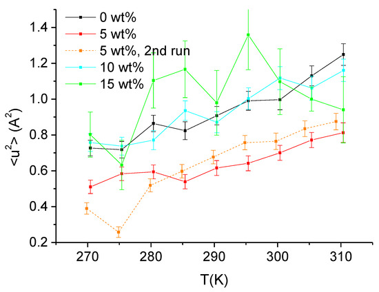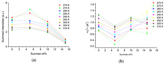 The four samples were scanned elastically within the temperature range from 270 to 310 K in steps of 5 K. After correction and normalization of the raw data, we first calculated the EINS of Equation (1) summed over all available Q-values. Such a quantity has smaller error bars due to the increased statistics and only depends on external parameters as temperature and the sucrose concentration. In Figure 1a, we present the summed intensities as function of wt% of sucrose at all measured temperatures. Higher temperature has the expected effect of lowering the intensities. In contrast, increased intensity depicts slower dynamics as more neutrons are scattered in a way to stay within the instrumental time window. All curves show a non-linear dependence on the sucrose concentration, with a maximum of intensity around 5 wt%. At 10 wt%, the intensities drop significantly, but present a pronounced dependence on temperature. In contrast, at 15 wt% all points seem to converge. We further used Equation (2) to extract the MSD of the same data and to plot them also as function of sucrose concentration (see Figure 1b). The MSD are mainly inversely proportional to the square of the summed intensities [38], so here we find a minimum at around 5 wt%. As the data have lower statistics, the errors are bigger and the variations higher, especially at 15 wt% where the protein quantity and therefore the data quality was below the other curves.