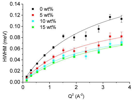 Further, we determined the HWHM of the Lorentzian curves of the samples (see Figure 6 and Figure 7), plotted them as function of Q2 and fitted them with one of the models.