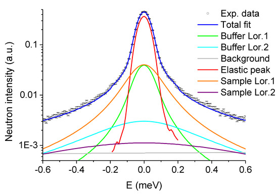 For the analysis of QENS data of the complete samples, we fixed then the HWHM of the two Lorentzians attributed to the buffer as well as the ratio of the absolute intensities between them, but let their absolute values vary freely together. Then, two Lorentzians were added to account for the sample. Figure 4 presents an example of such a fit of the experimental data with one elastic peak, four Lorentzian curves and a straight line to account for the background, which gives very good fit results.